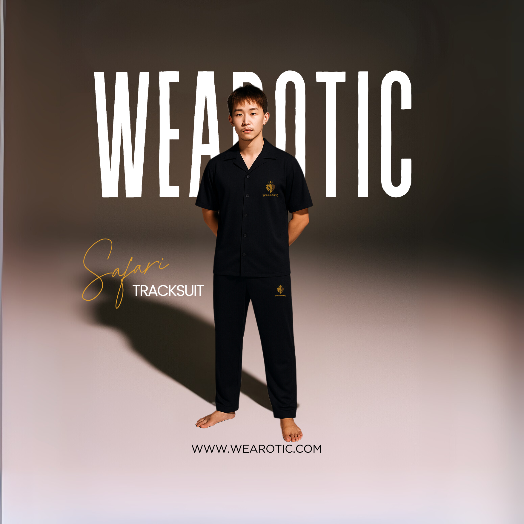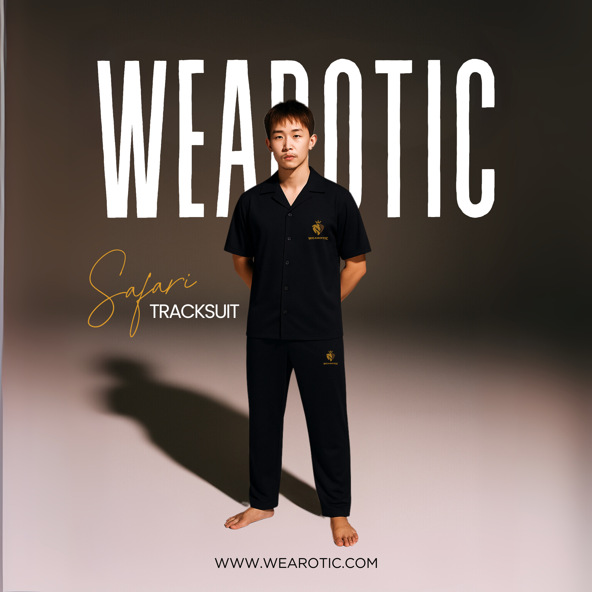 The Safari Tracksuit by WEAROTIC is crafted for those who want comfort without losing style. Made from soft, breathable fabric, it gives a relaxed fit that keeps you at ease all day. The collared button-down top paired with straight-cut bottoms adds a touch of sophistication, making it versatile enough for casual outings, lounging, or travel. The golden embroidered logo stands out against the deep black fabric, giving it a premium and distinctive look.